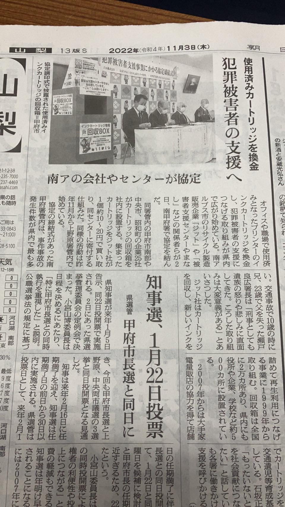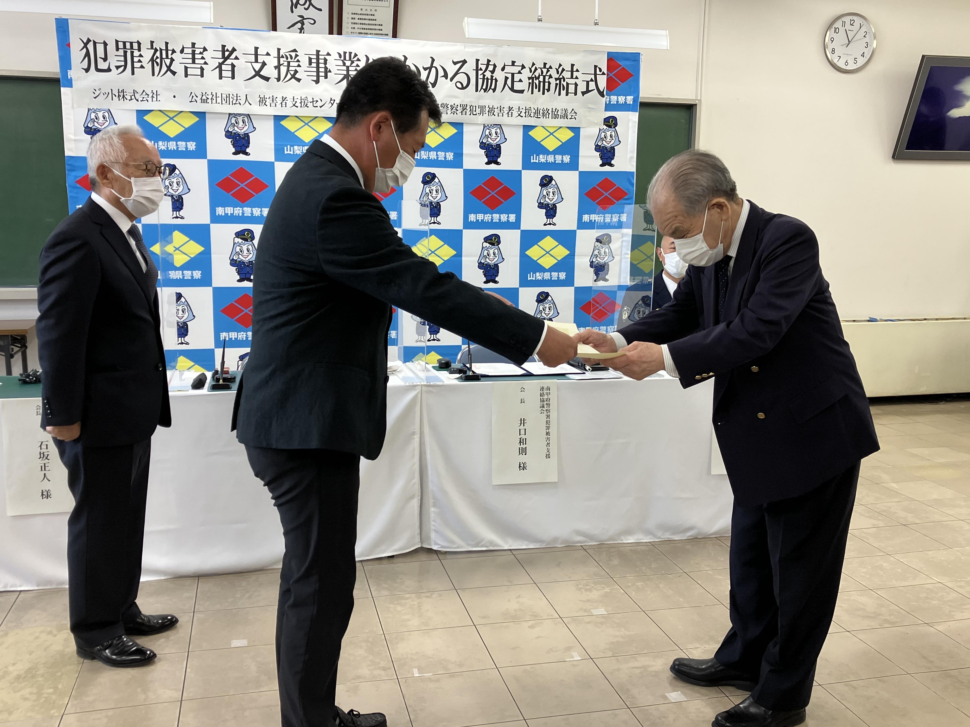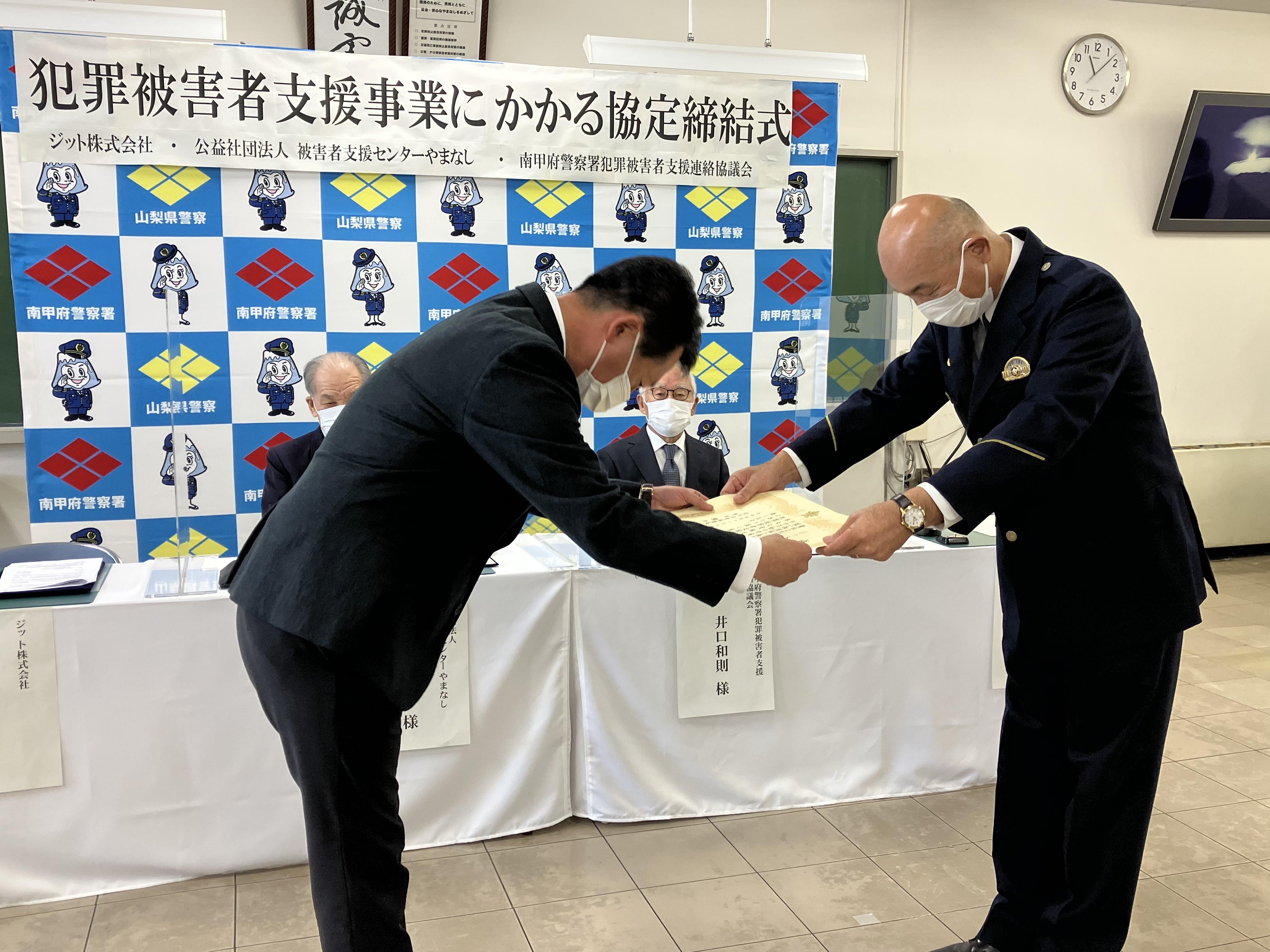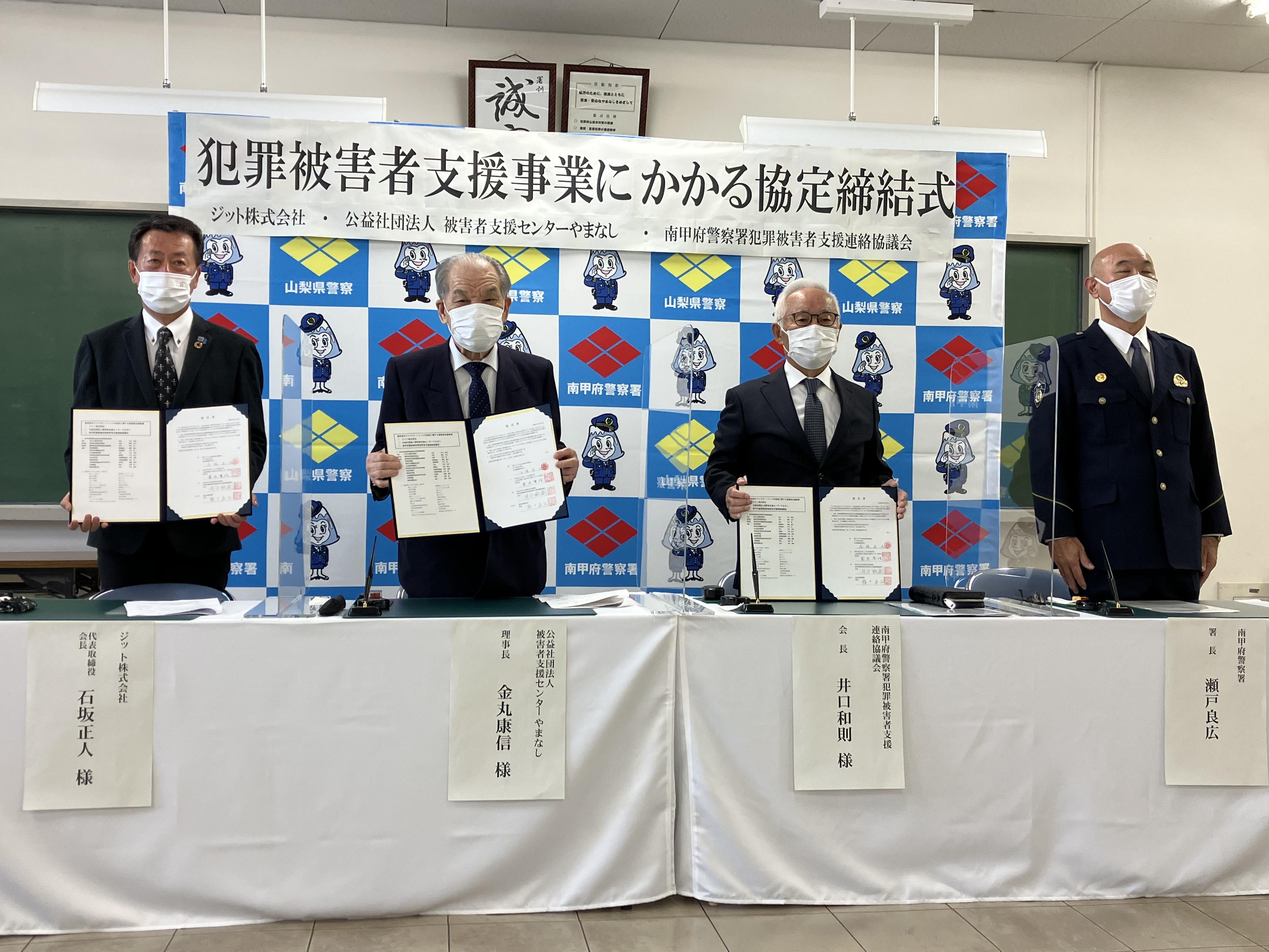 甲府南警察署が立会人となり、公益社団法人被害者支援センターやまなし、南甲府警察署犯罪被害者支援連絡協議会と当社で犯罪被害者等を支援するため、使用済みインクカートリッジ回収等について、協定を結びました。