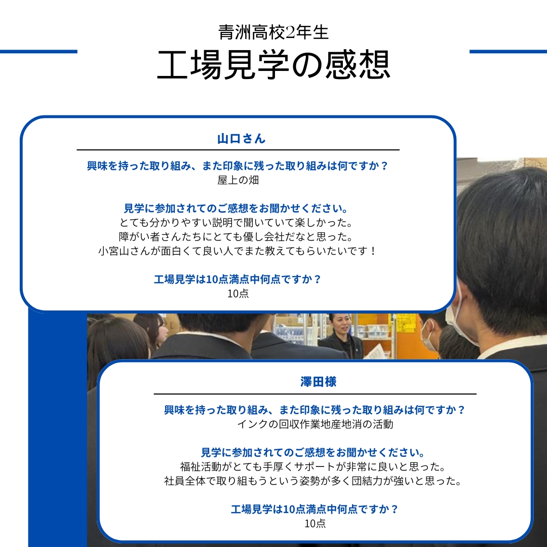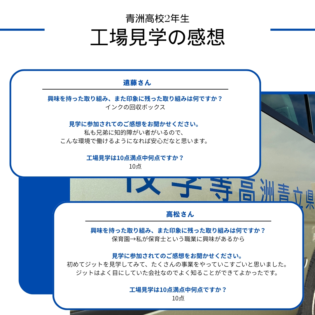 ジットの社員から素晴らしいご案内をもらい、リサイクルインクの製造現場、NPO法人ジット会たいようの現場や取り組みをご覧いただきました。そして福祉の取り組みまで。生徒の皆様はジットグループの社員の誘導をもらい、仕事と社会貢献、地域とのつながりについて理解を深めていただく機会となりました。